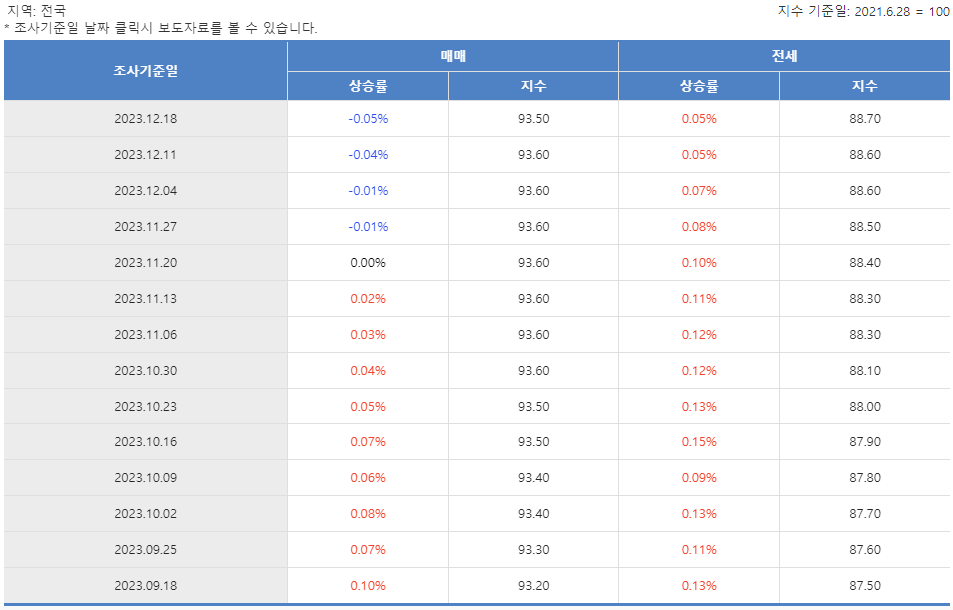언론에서 반등할 것이라던 집값이 이번 주에도 여전히 하락폭을 이어가고 있습니다. 최근 언론에서 많은 뉴스 가시들이 나오고 있습니다. '집값이 반등한다', '바닥을 다졌다', '어떤 지역은 수억이 올랐다' 이렇게 말하고 있습니다. 그런데 실제 우리가 현장에서 느끼는 바는 조금 다른 것 같습니다. 정확한 지표는 실거래가를 바탕으로 작성된 매매 증감률을 보면 알 수 있습니다. 매매 증감률이 올라가면 가격이 올라가는 것이고, 매매 증감률이 떨어지면 가격이 떨어진다고 생각하시면 됩니다. 우리가 보는 지표인 KB부동산에서 발표한 매매 증감률을 확인해 보면 집값은 여전히 하락을 하고 있습니다. 한국부동산원에서 발표한 자료도 마찬가지로 하락을 가리키고 있습니다. 그러면 그 하락이 어느 정도를 나타내고 있는지 한번 자세하게 알아보도록 하겠습니다. 아파트 매매 증감률 '전국'을 보면 -0.05%로 하락을 하고 있습니다. 서울 같은 경우에도 -0.04% 하락을 하고 있고, 그전 주와 비교를 해 보았을 때도 하락폭이 커지고 있는 것을 확인하실 수 있습니다. 그리고 이렇게 커진 하락폭이 줄어들고 있지 않고 있다는 것도 알 수 있습니다. 그리고 여러분들이 궁금해하실 수 있는 수도권의 경우도 하락을 나타내고 있습니다. 수도권이 왜 중요하냐고 하면 결국에는 서울의 뱡향이 수도권으로 번져 나가고 수도권의 방향이 전국으로 번지기 때문입니다. 그리고 우리가 중요하게 봐야 할 것이 전세가입니다. 전세가가 올라가는 것을 보고 이제 집값도 올라갈 것이라고 예상하시는 분들이 있습니다. 그런데 전세 가격의 경우는 2년 전 가격이랑 비교를 해 보아야 합니다. 그때보다 지금은 여전히 가격이 많이 떨어진 상태고 지금 올라오는 전세 가격은 여전히 많이 떨어진 가격에서 올라오고 있는 가격입니다. 아직은 2년 전에 우리가 들어갔던 전세 가격보다 낮은 가격이라고 생각하시면 됩니다.