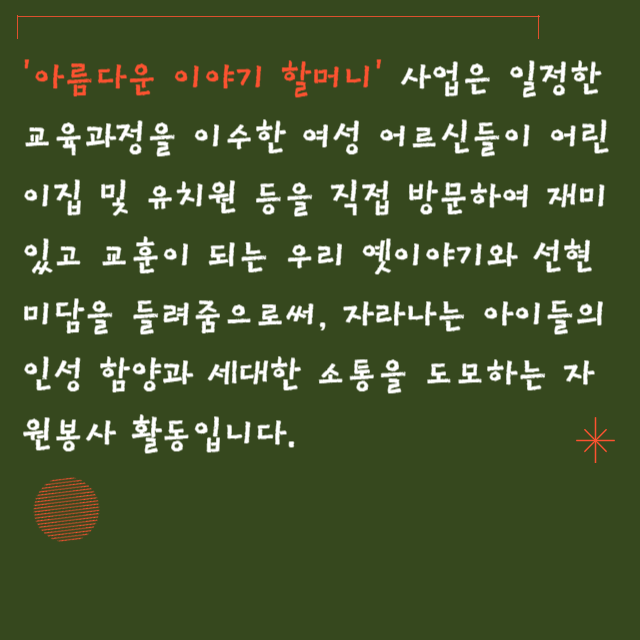 이야기 할머니를 처음 해 보시는 분들은 어려우실 거라 생각하실 수도 있겠지만 교육받고, 시작해서 익숙해지면 5년 동안 즐겁게 소일거리 겸 봉사하는 마음으로 활동하실 수 있을 것 같습니다. 또한 기존에 손주를 봐주신 경력이 있으신 분들뿐만이니라 예비 할머니 분들도 교육받고 일해 보시면 실제 손주들에게도 재미있게 이야기도 들려줄 수 있어서 좋을 것 같습니다. 관심 있으신 분들은 일정 참고하셔서 늦지 않게 신청하세요. 감사합니다.