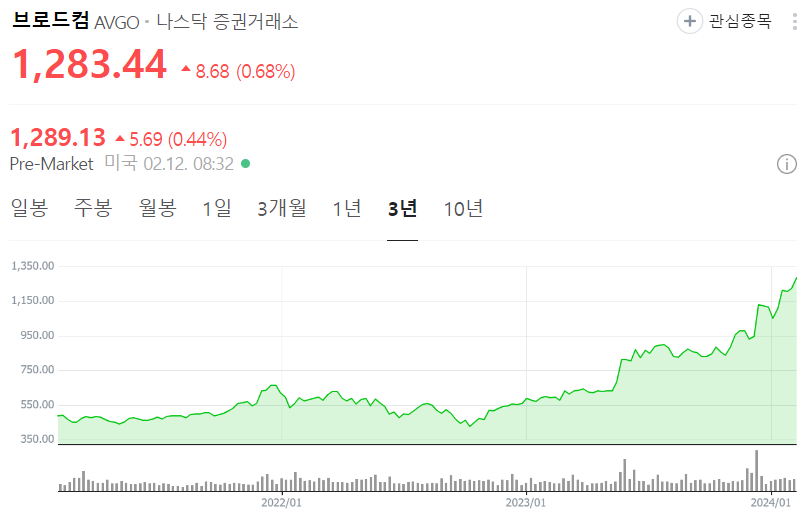 네트워킹과 서버 연결성 분야에서의 리더입니다. AI작업을 가속화하는 Tomahawk5 데이터 센터 스위치를 개발했습니다. 최근 VMware인수를 통해 AI기술을 다각화하고 있습니다. 지난 5년 간의 주가가 353% 올랐습니다.