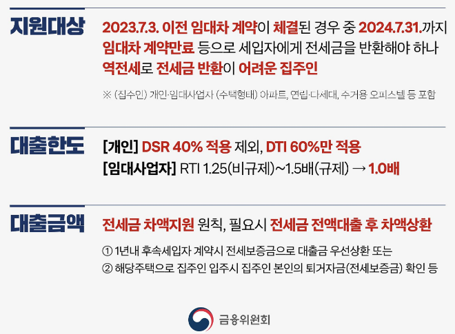 역전세로 인해 기존 세입자의 전세금 반환에 어려움을 겪는 집주인이 전세금 반환용도로 은행권(인터넷은행 제외) 대출을 이용할 경우, 전세금 차액분(기존 전세금-신규 전세금) 등에 대한