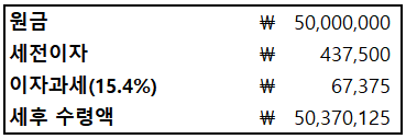 예를 들어 5천만 원을 1년 동안, 연 이율 0.1%에 저축하면