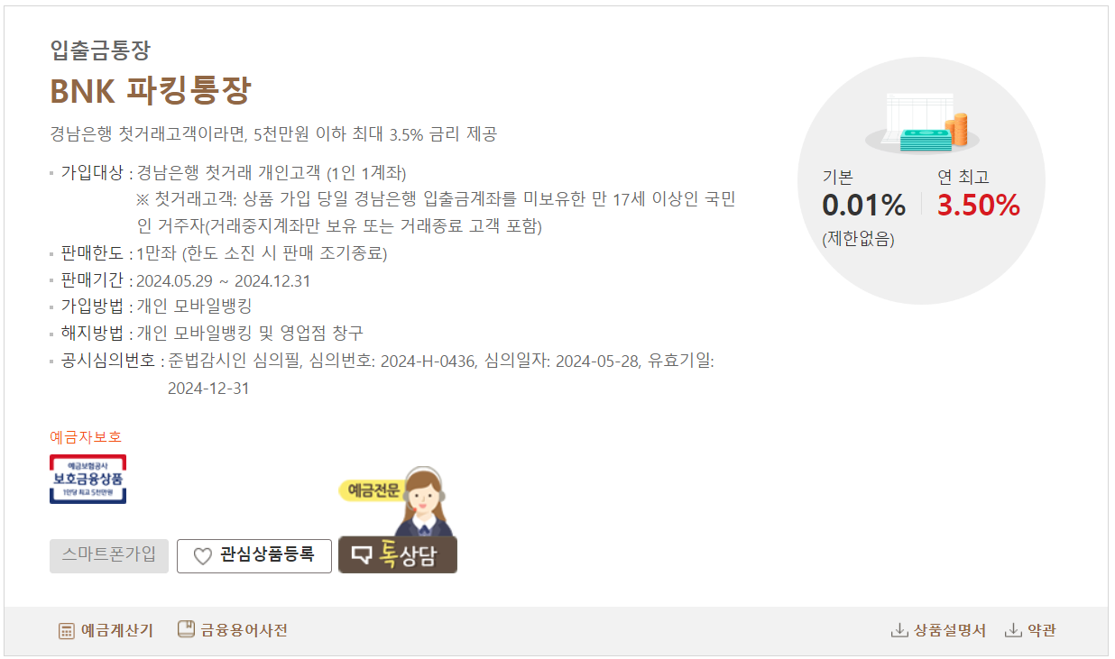 BNK 경남은행 파킹통장은 최고 연 3.5%를 지급하는 입출금 통장입니다.
