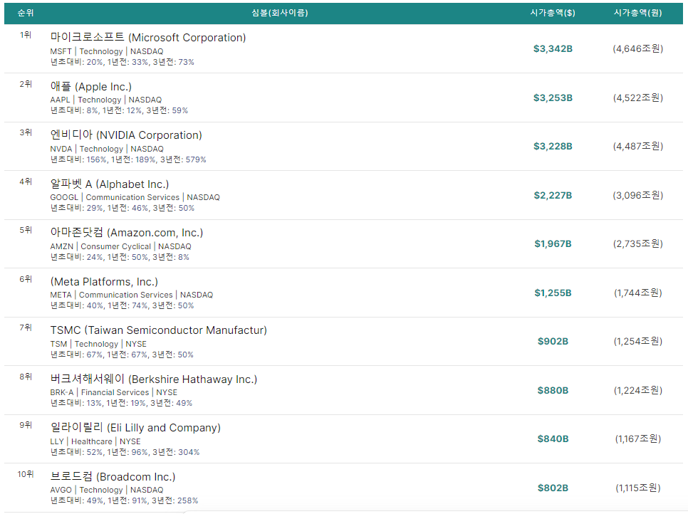 2024년 얼마 전 엔비디아가 잠깐 1위를 했었는데요... 마찬가지로 AI 최대 기업니다.